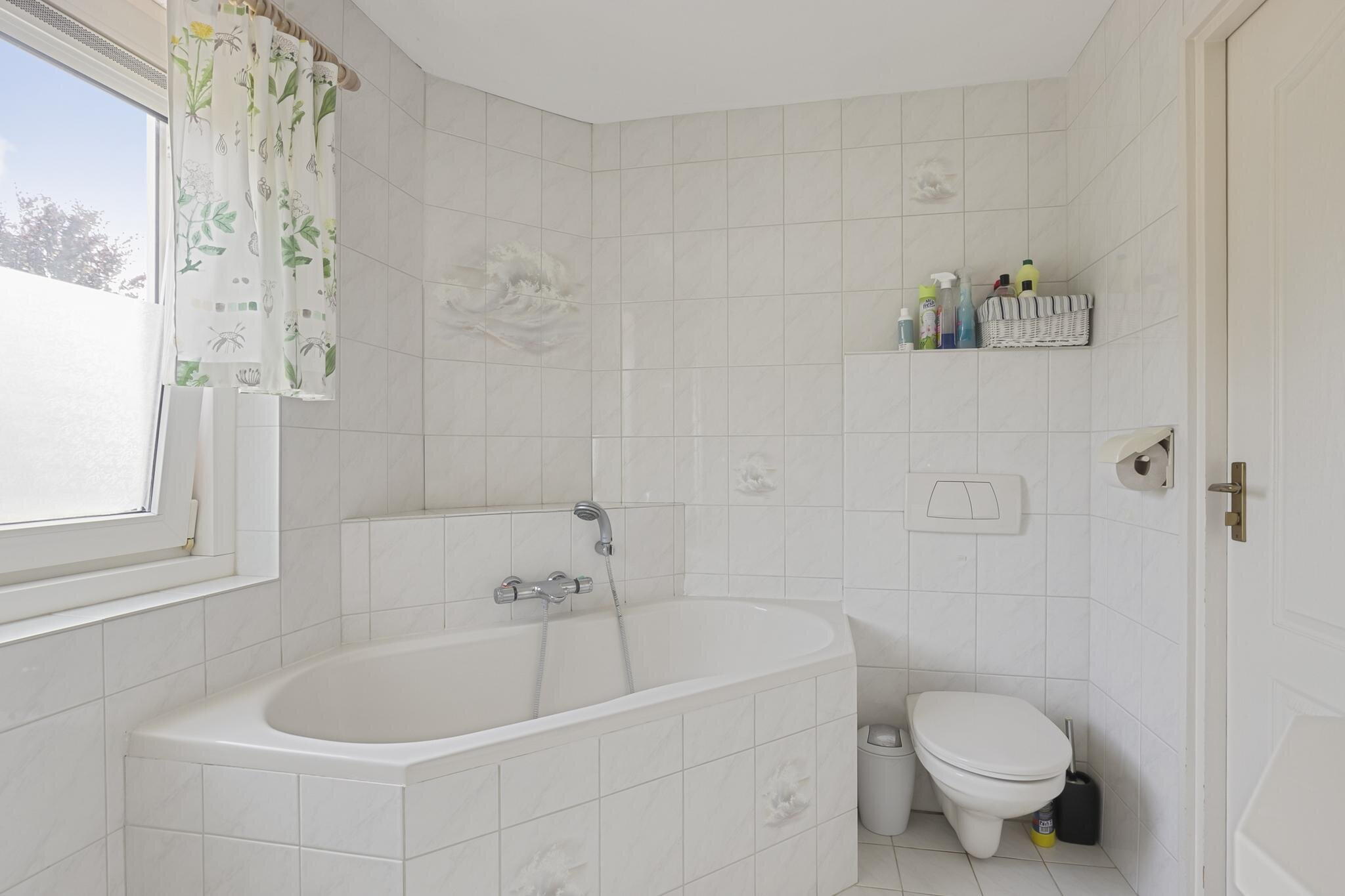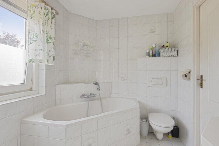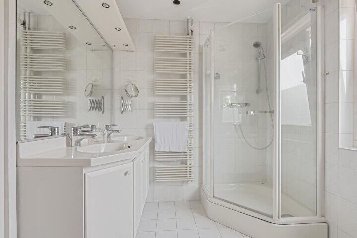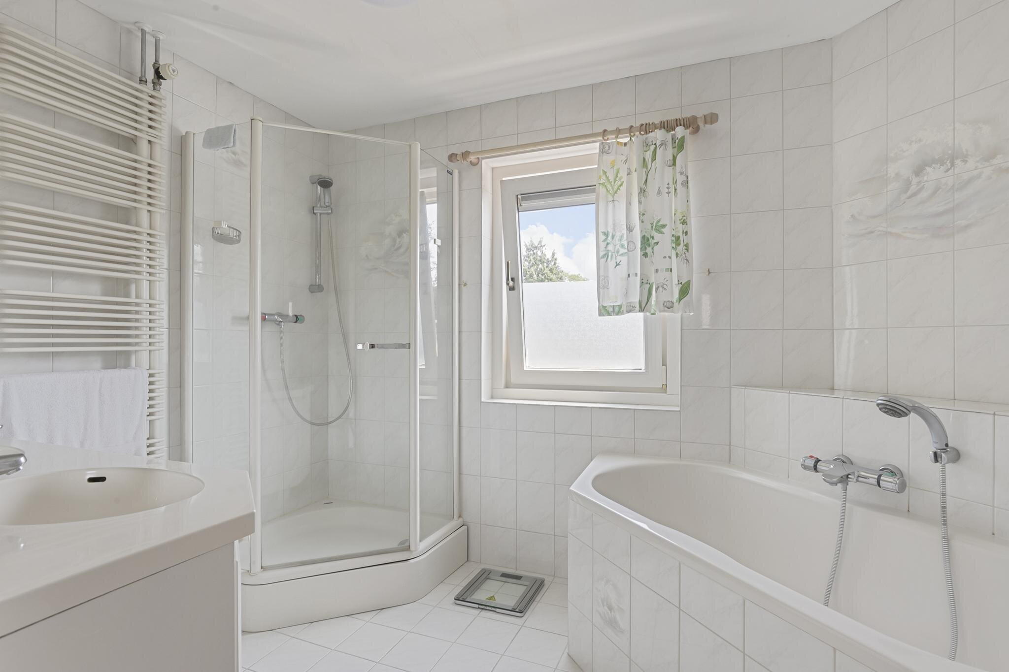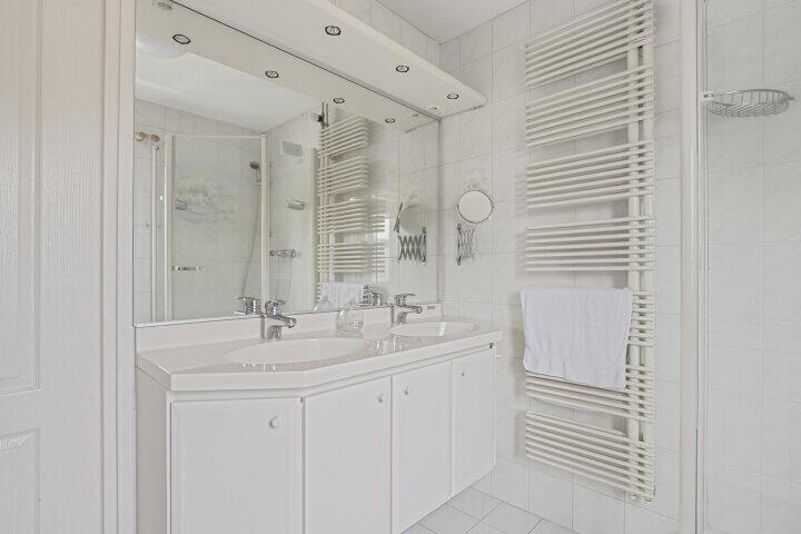 - Ligbad, toilet, douche, dubbele wastafel, wastafelmeubel